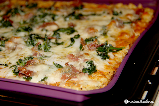 - Espalhar o molho de tomate, colocar ingredientes a gosto e polvilhar com mozzarela
