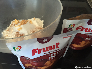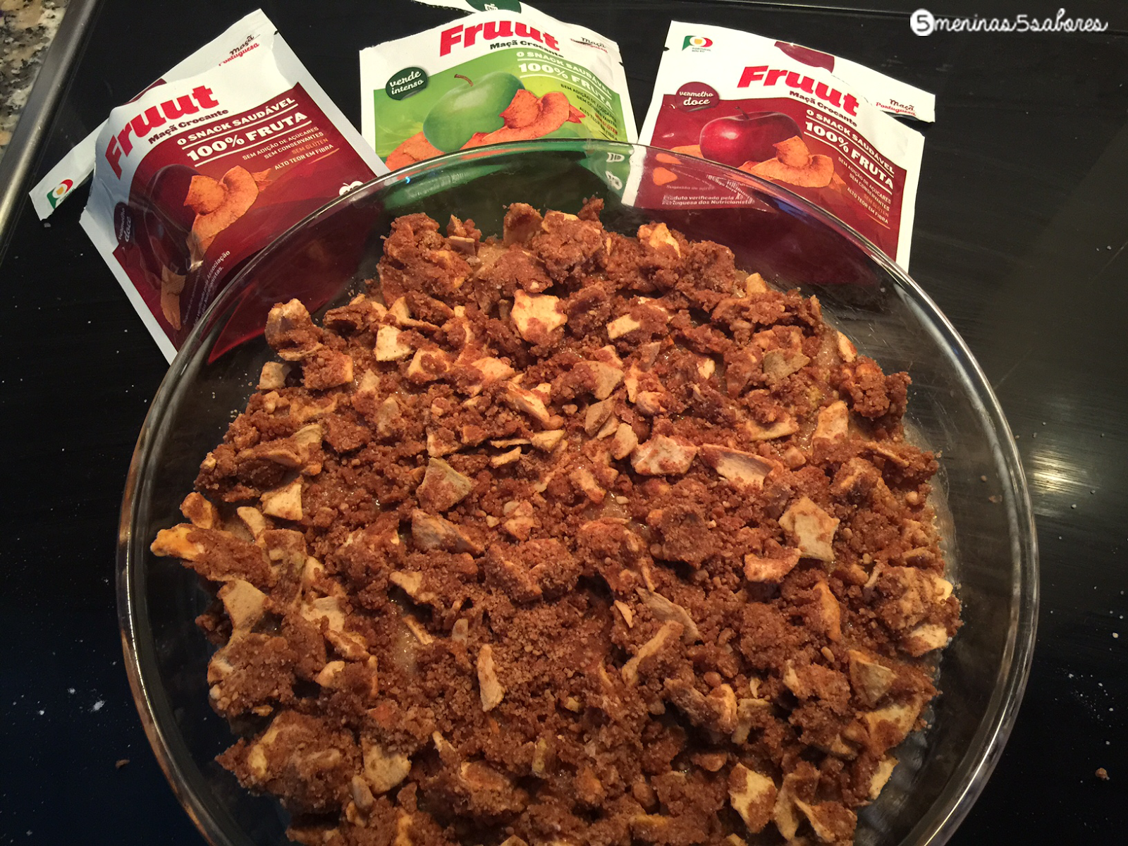 numa taça a farinha, a canela, o açúcar, a maçã Fruut aos pedaços e a manteiga de amendoim e misturar tudo