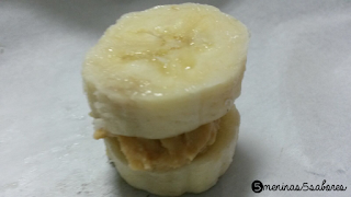 - Pegue em dois pedaços e junte-os. Entre os dois pedaços coloque manteiga de amendoim. Repetir para os restantes pedaços e colocar no tabuleiro previamente preparado.